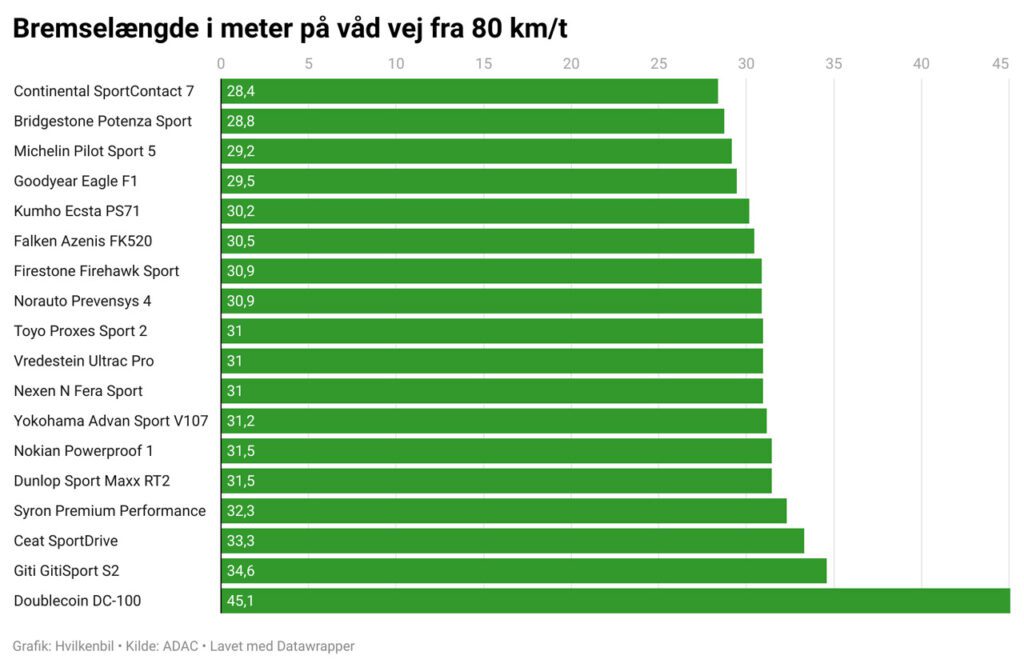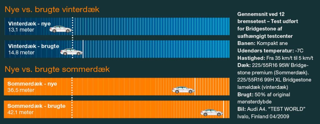 - Grebsniveau og bremselængde: En test viser, at vinterdæk giver markant kortere bremselængde end sommerdæk i kolde, frosne eller våde forhold.