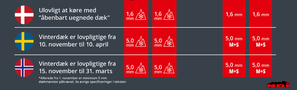 - Mindste tilladte mønsterdybde hele året for person- og varebiler er 1,6 mm.